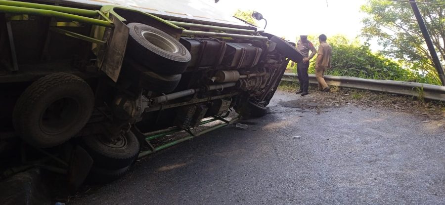Maninjau, kaba12 — Akses jalan ruas Maninjau- Bukittinggi kembali tersekat menyusul terbaliknya truk dengan nomor polisi B 9045 BXU di kelok 17, Selasa, (16/4).