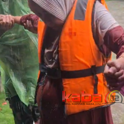 Proses evakuasi ratusan warga yang secara bertahap dibawa ke lokasi aman dari jangkauan banjir, dengan sistim berjalan melewati jalur jalan yang sambal memegang tali panjang yang dipandu petugas penyelamat.