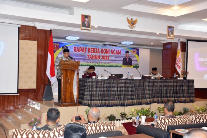 Lubukbasung,kaba12 — Bupati Agam Dr.Andri warman buka Rapat Kerja ( Raker) KONI Kabupaten Agam tahun 2023 di Hotel Sakura Syariah, Lubukbasung, Kamis, (8/6) malam.