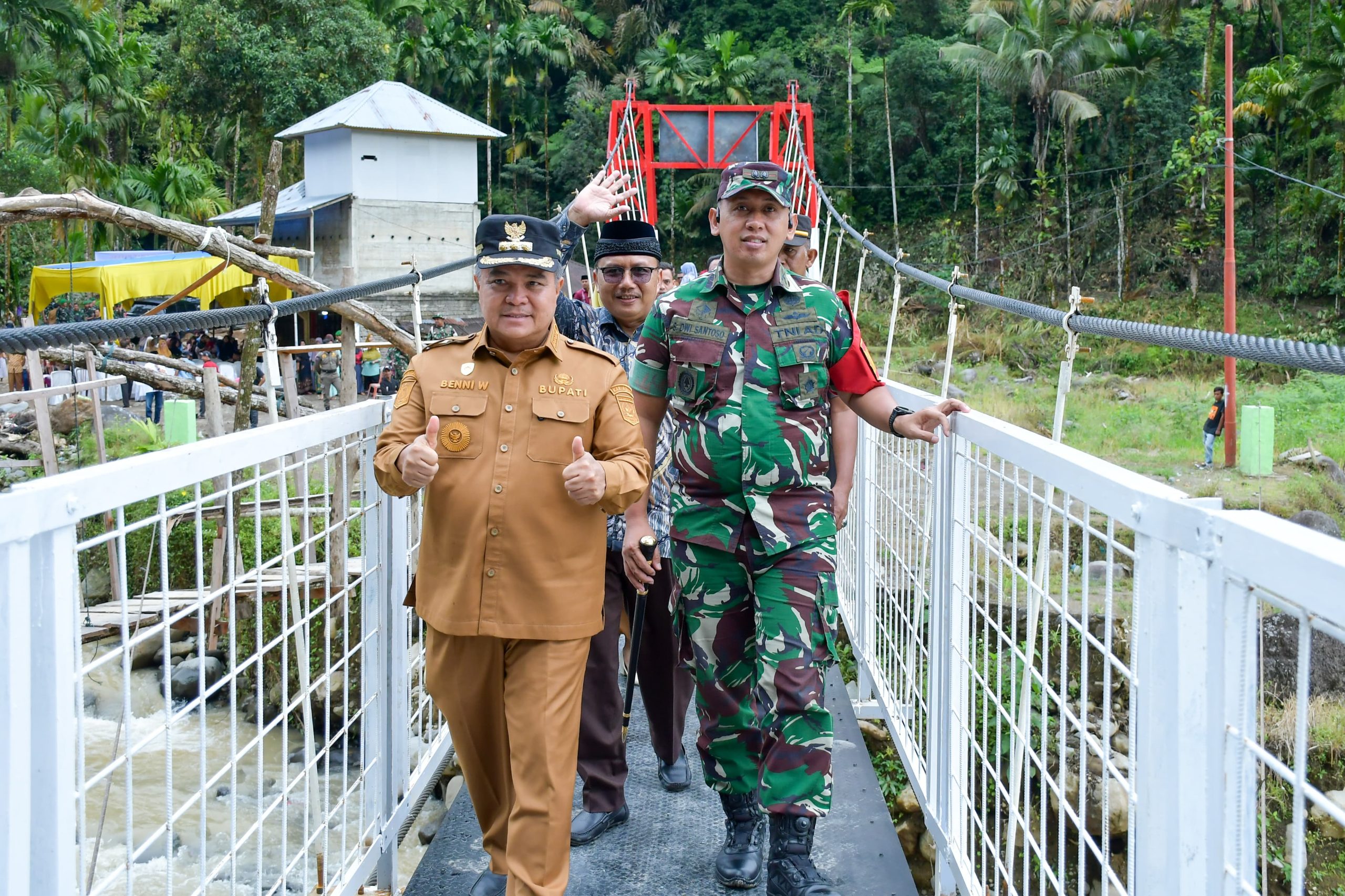 Malalak, KABA12 — Komandan Kodim (Dandim) 0304/Agam, Letkol Inf Slamet Dwi Santoso, S.I.P., bersama Bupati Agam, Benni Warlis, resmikan jembatan gantung perintis garuda, yang berlokasi di Jorong Sini Air, Nagari Malalak Selatan, Kecamatan Malalak, Kabupaten Agam, Selasa (21/04).
