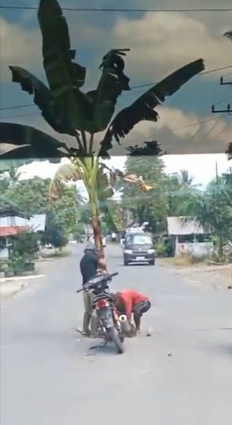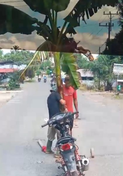 Pasalnya, pohon pisang yang ditanam, sepenuhnya untuk mengantisipasi jatuhnya korban bagi pengguna jalan, khususnya sepeda motor, karena jalur jalan yang berlobang, apalagi jika malam hari dan jika hujan, “banyak warga yang terjadi dan luka-luka, lobangnya dalam, apalagi jika malam hari, jalurnya gelap, “sebutnya.