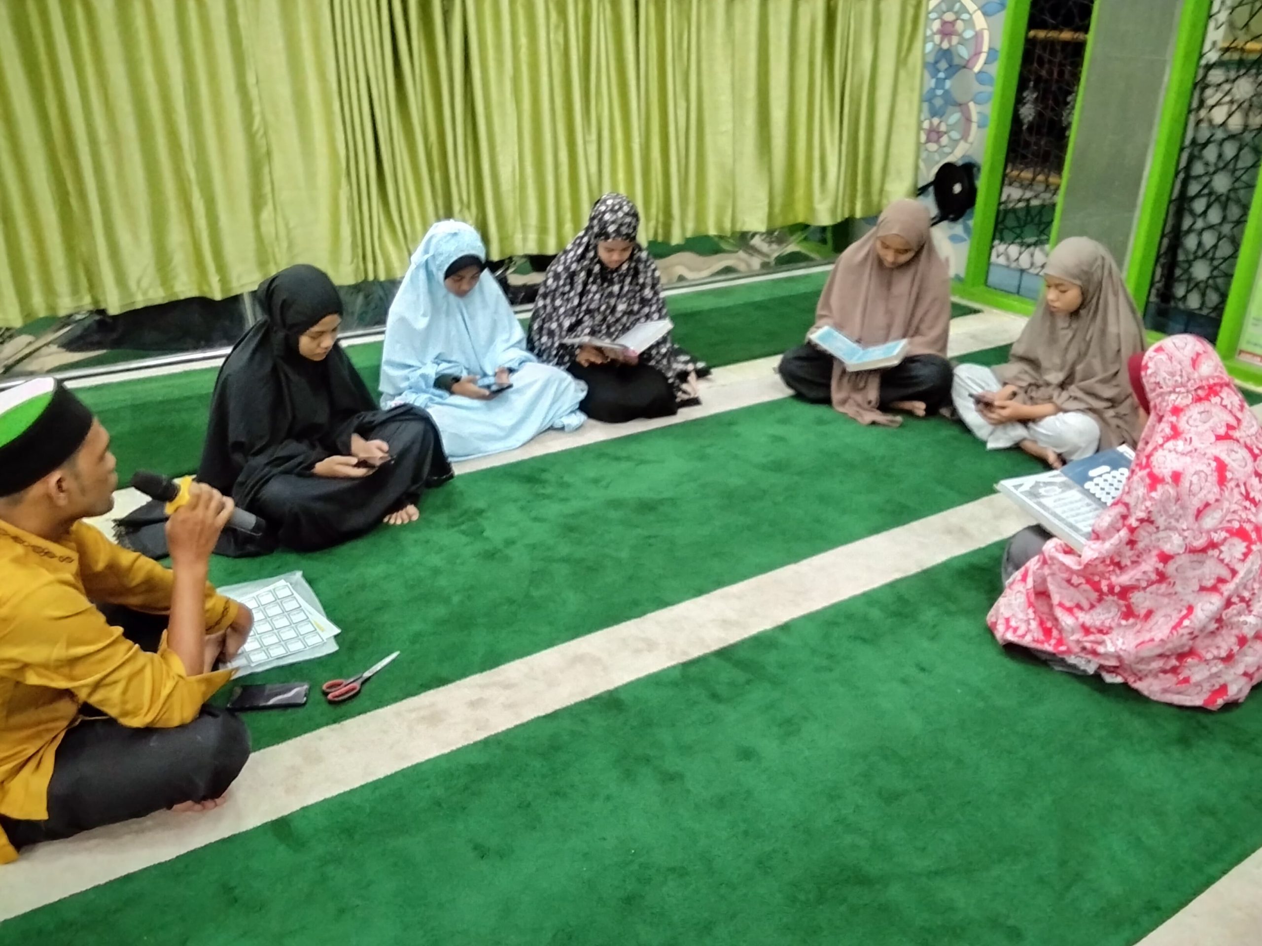 Dengan duduk melingkar di atas sajadah, para remaja membaca Al-Qur’an secara bergantian didampingi pembina.