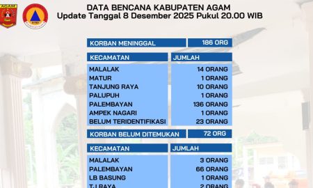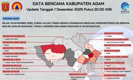 Lubukbasung,kaba12 — BPBD Agam melansir data resmi sebanyak 165 warga Kabupaten Agam dinyatakan meninggal dunia dampak bencana hidrometeorologi 2025 yang tersebar di...